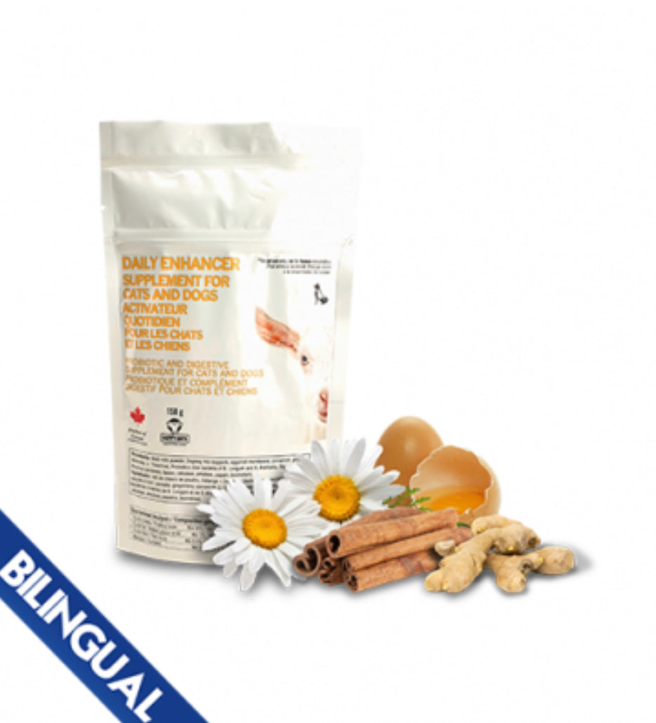 The daily enhancer is a unique blend of the best ingredients to enhance your pet's health. Goat milk is very easy to digest, is high in calcium and Vitamin A, and shows properties that prevent arthritis. Most cats and dogs love it! Egg yolk is loaded with vitamins and omega-3 fats. dogs love the taste of egg! Cinnamon is an anti inflammatory, ginger is a great digestive aid, chamomile relaxes!