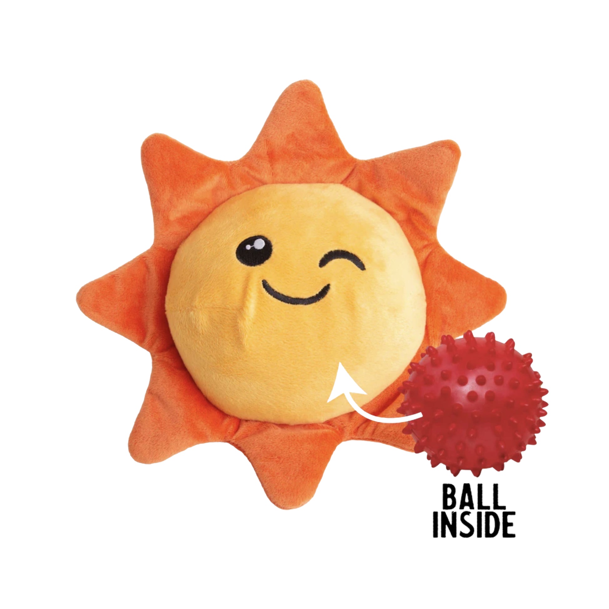 Treat your pup to the perfect companion for a sunny day - Sweet Sunshine (2 in 1 Toy)! This adorable plush yellow squeeker toy features an irresistible winking eye surrounded by fun orange flames and will bring all the joy of summer fun wherever it goes. Toy is made from recycled water bottles and contains eco-friendly squeaker and crinkle material for hours of crinkly, squeaky fun! Toy is 8” in size.